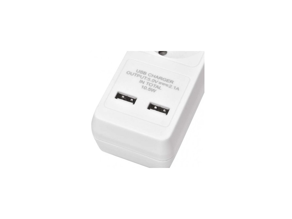 barva: bílá|délka: 2 m|dětské clonky: ano|krytí: IP20|materiál zásuvky a vidlice: plast|max. zátěž: 3 680 W|napětí: 250 V~|počet zásuvek: 3|prodejní obal: 1 ks, závěs|proud: 16 A max.|průřez vodiče: 1,5 mm²|typ izolace: PVC|USB výstup: 2× Σ 2,1 A max. (10,5 W)|vodič: H05VV-F3G|vypínač: ano