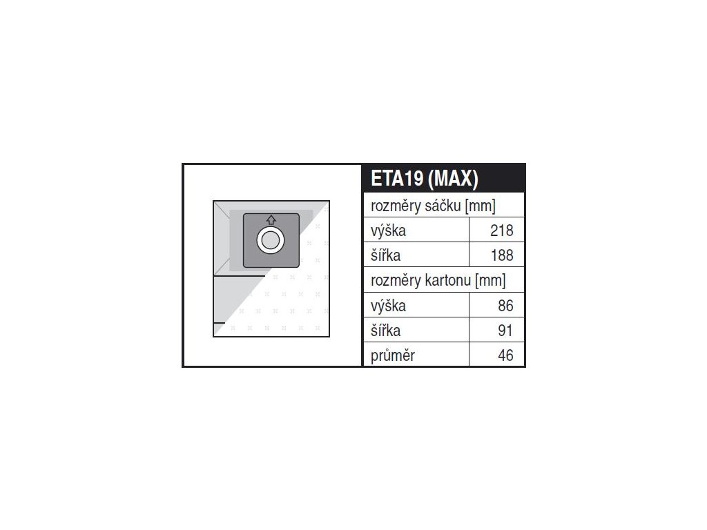 Sáčky do vysavače z netkané textilie ETA19 MAX. Balení obsahuje 4 ks textilních sáčků ETA19 MAX, vůni do vysavače zdarma, která krásně provoní Váš byt, mikrofiltr pro Váš vysavač.