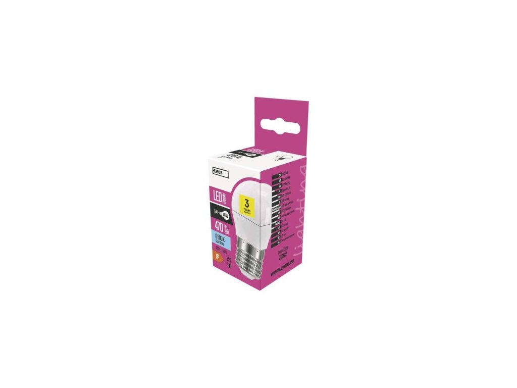 barva světla: studená bílá|energetická třída (od 1.9.2021): F|index podání barev (CRI): 80|náhrada za žárovku: 40 W|napětí: 230 V~/50 Hz|patice (uchycení žárovky): E27|počet čipů: neuvádí se|počet spínacích cyklů: 25 000|příkon: 5 W|prodejní obal: 1 ks, krabička|řada: CLASSIC|rozměr: 74 × 45 × 45 mm|stmívatelná: ne|světelná účinnost: 94 lm/W|světelný tok: 470 lm|technologie: LED|teplota chromatičnosti: 6 500 K|tvar: Mini Globe|typ čipů: SMD|účiník: 0,53|úhel vyzařování: 250°|záruční doba: 3 roky|životnost: 30 000 hodin